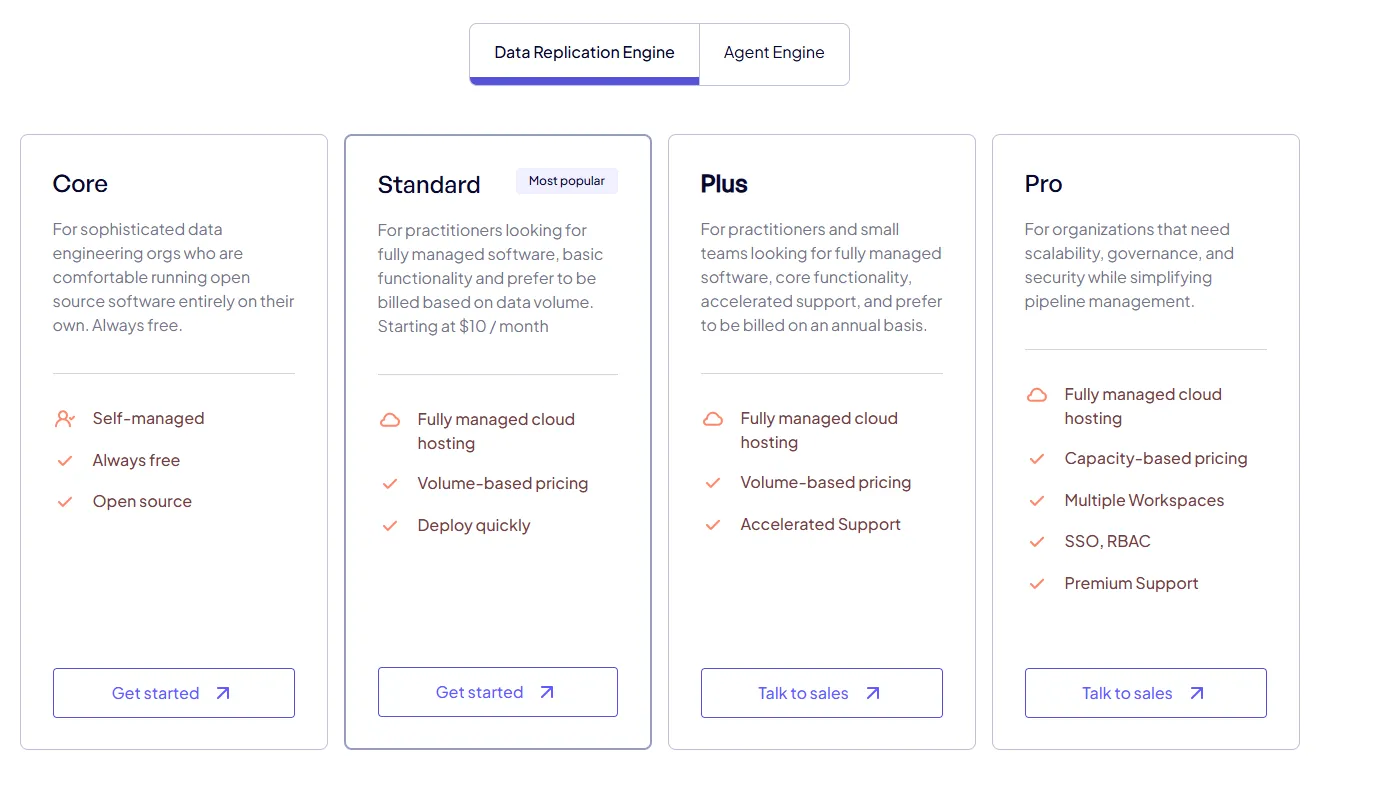 Airbyte has two separate product lines, each with its own pricing: the Data Replication Engine (for ELT pipelines) and the Agent Engine (for AI agent data infrastructure).
