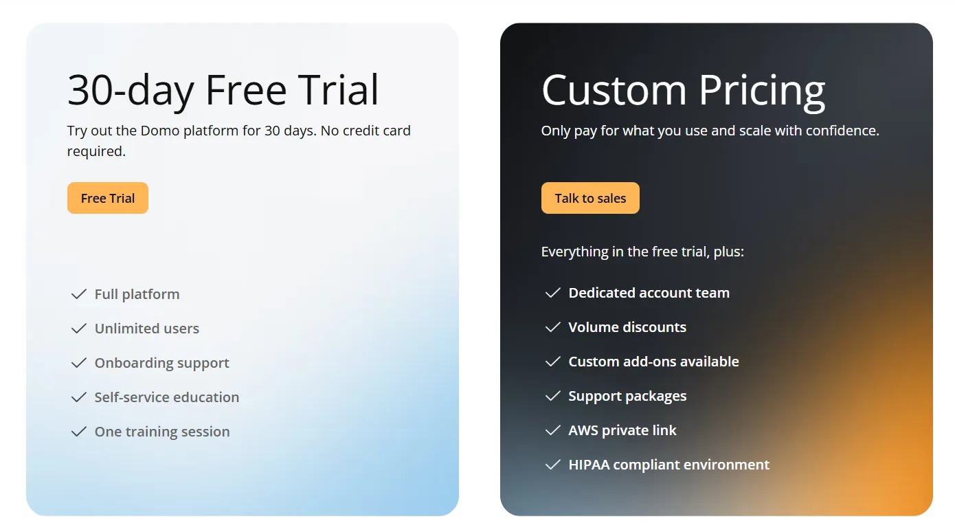 Domo | All-in-one cloud BI with built-in data ingestion from hundreds of sources, dashboards, and AI-driven automation. | Custom pricing; 30-day free trial. |
