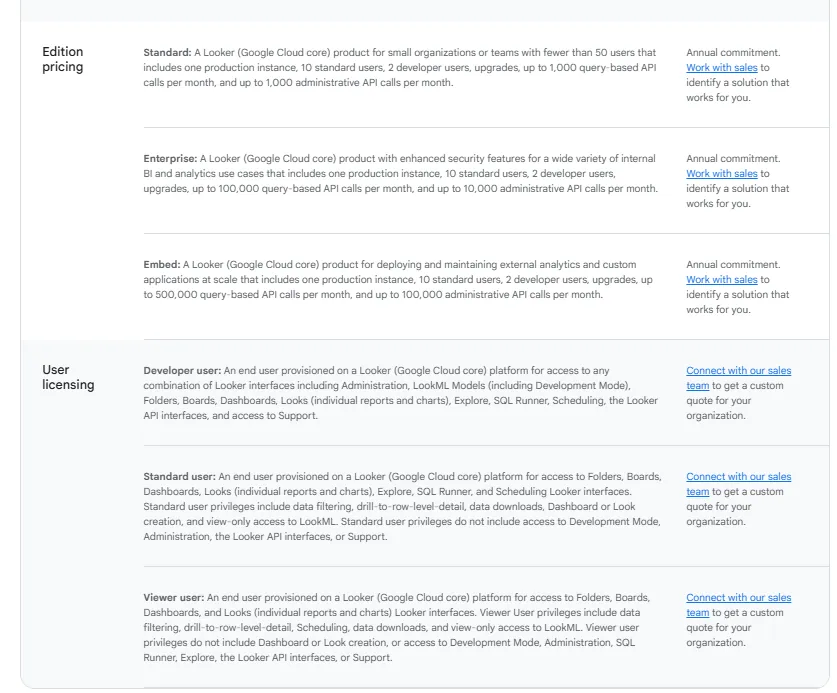 | Looker | Governed, warehouse-native BI with centralized metric definitions and strong embedding | Pricing not public |