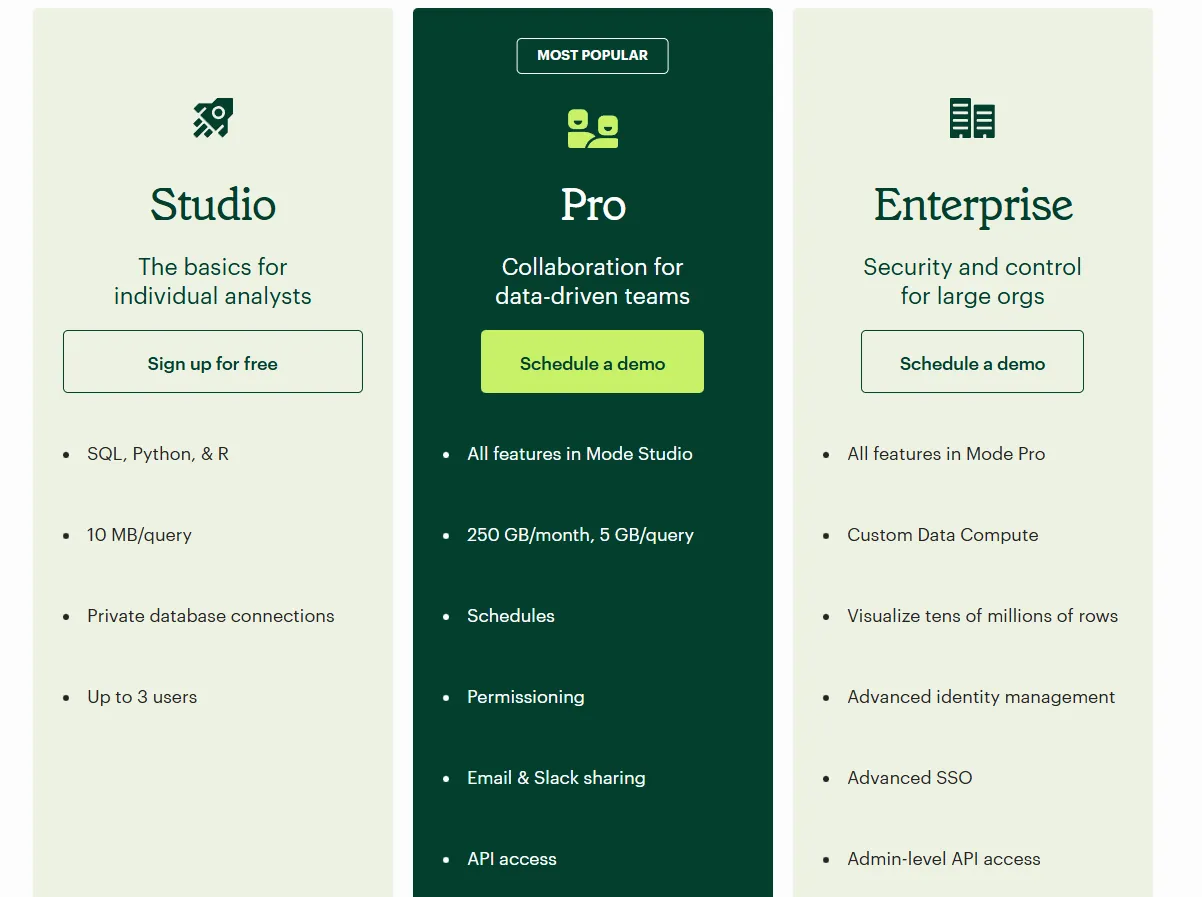 Mode offers three pricing tiers, starting with a free plan for individual analysts and scaling up to enterprise-grade analytics for large organizations: