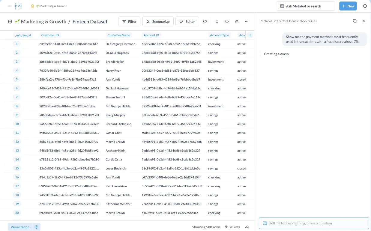 - Natural language querying with Metabot AI: Ask questions in plain English and get AI-generated queries and visualizations on top of your live database.