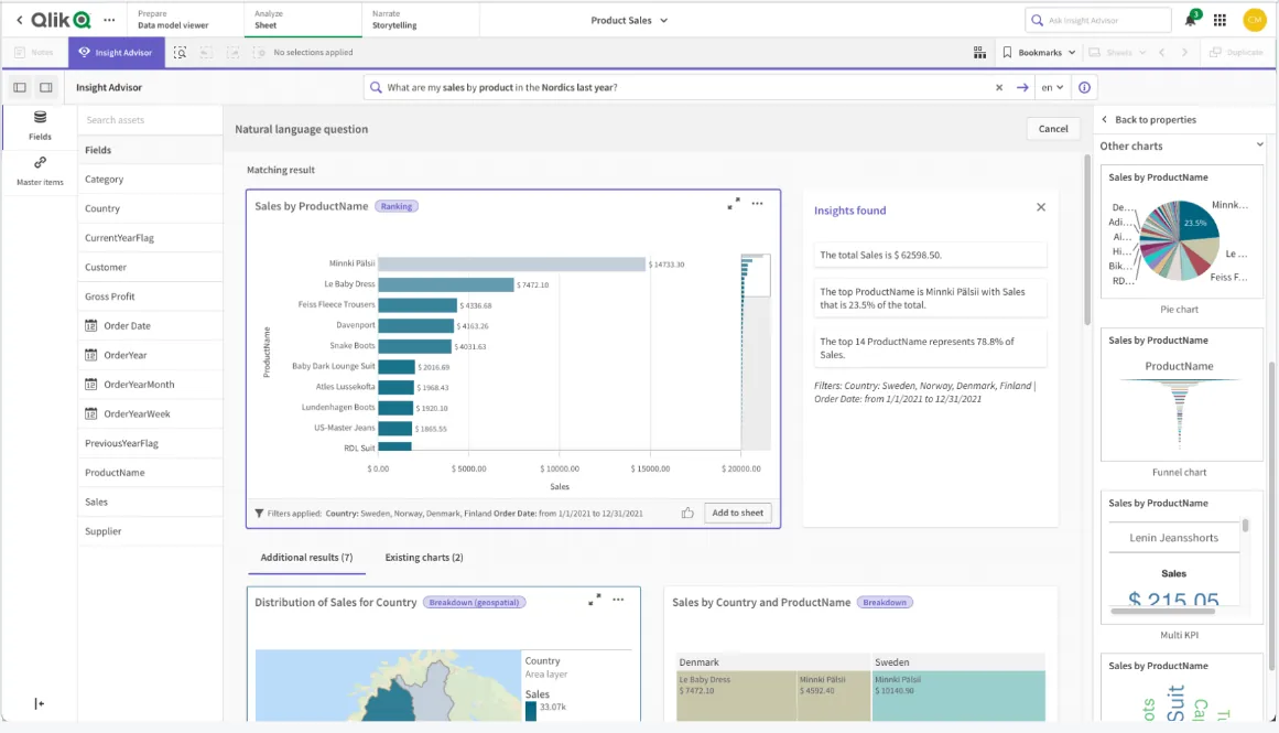 Unlike Basedash's linear prompt-to-chart approach, Qlik encourages freeform exploration where selecting any value instantly recalculates everything in context.