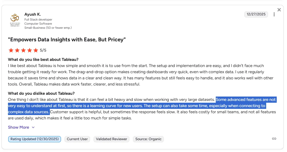 "One thing I don't like about Tableau is that it can feel a bit heavy and slow when working with very large datasets.’’ - G2 Review