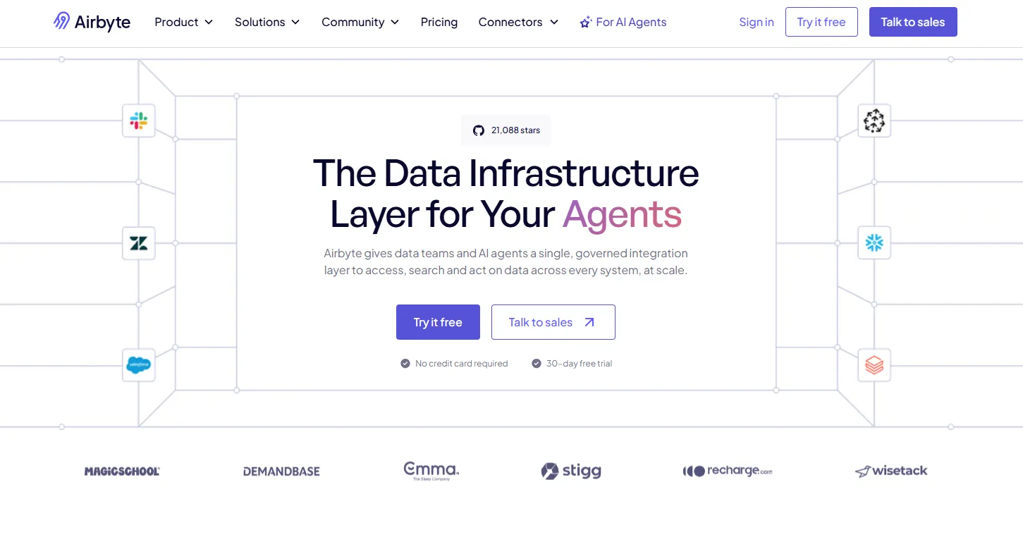 Airbyte | Open-source ELT platform with 600 connectors, AI-assisted connector builder, and flexible cloud or self-hosted deployment. | Free (open source); cloud from $10/month (Standard). Agent Engine from $0/month. |