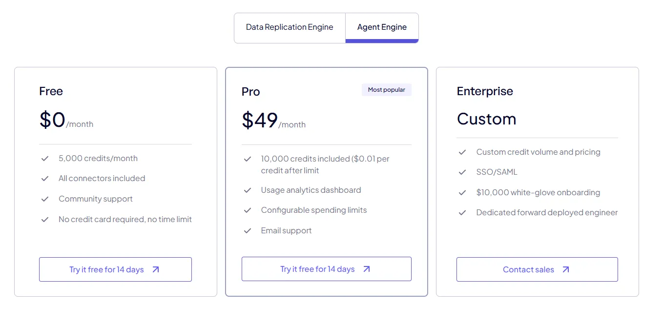 Airbyte has two separate product lines, each with its own pricing: the Data Replication Engine (for ELT pipelines) and the Agent Engine (for AI agent data infrastructure).