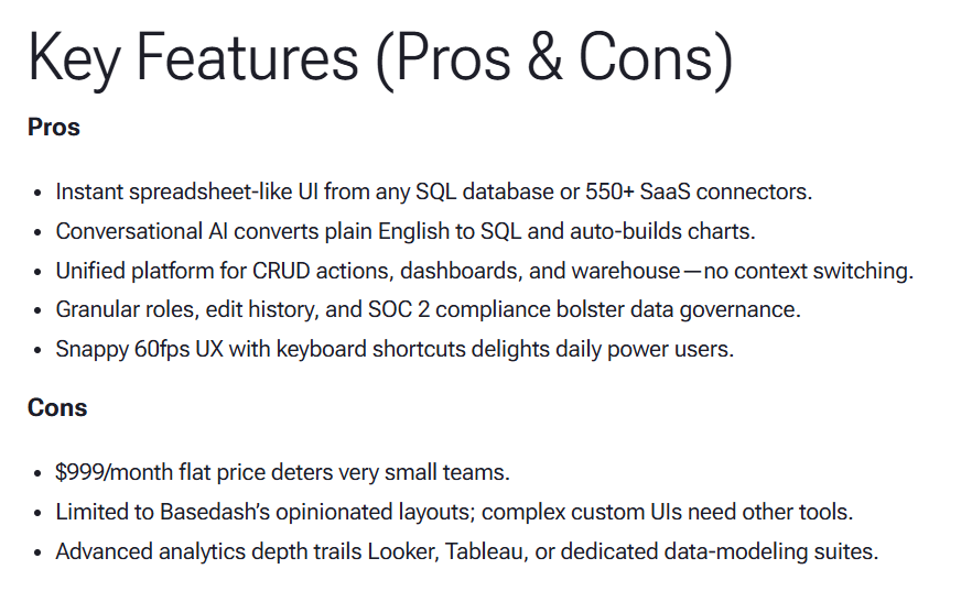 It goes beyond what Basedash offers by bundling data integration, app building, and workflow automation into a single platform, which can be useful for teams that don't want to stitch together multiple tools.