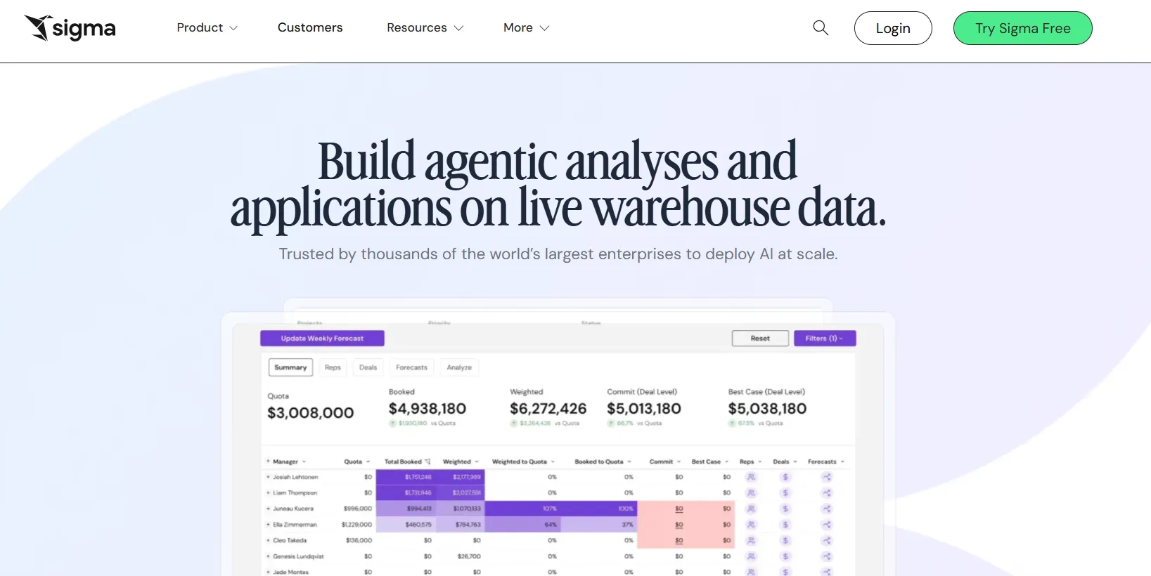 Sigma is a cloud-native analytics platform that lets business users analyze live warehouse data through a familiar Excel-like interface.