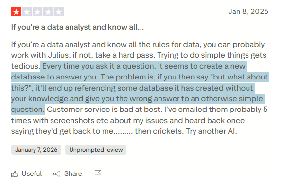 A Trustpilot reviewer describes how the tool creates intermediate databases behind the scenes that lead to conflicting outputs when you ask follow-up questions.