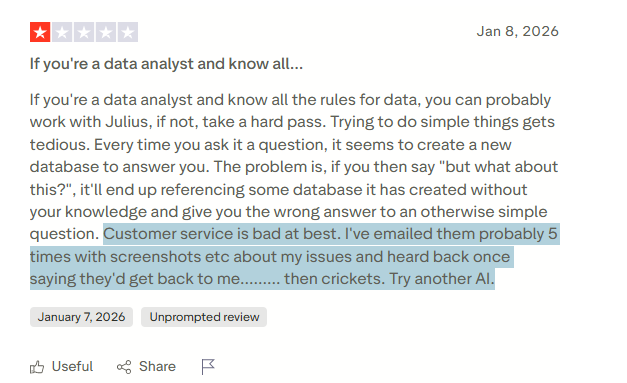 The most common complaint is that Julius AI can produce different answers to the same question depending on when and how you ask it.