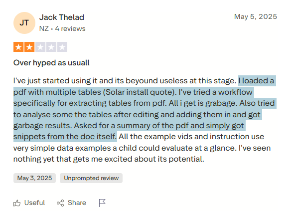"I loaded a pdf with multiple tables (Solar install quote). I've tried a workflow specifically for extracting tables from pdf. All i get is garbage. Also tried to analyse some the tables after editing and adding them in and got garbage results. Asked for a summary of the pdf and simply got snippets from the doc itself." - Trustpilot Review.