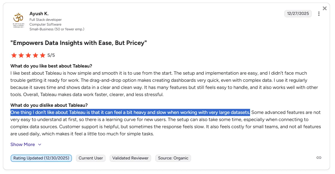 "One thing I don't like about Tableau is that it can feel a bit heavy and slow when working with very large datasets.’’ - G2 Review